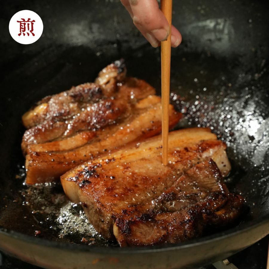 1.煎:解凍後先將鹹豬肉上的醃料剝掉(不要用水沖),鍋中加入少許油,將鹹豬肉放入後中小火慢煎,不停翻動煎至兩面金黃後撈出,切 片後即可上桌。