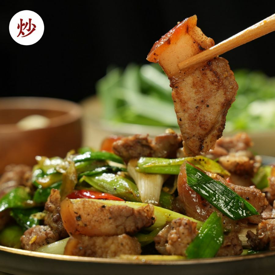 2.炒:解凍後先將鹹豬肉上的醃料剝掉(不要用水沖),蒜苗切斜片後備用,鍋中加入少許油,將鹹豬肉片後放入鍋中,
